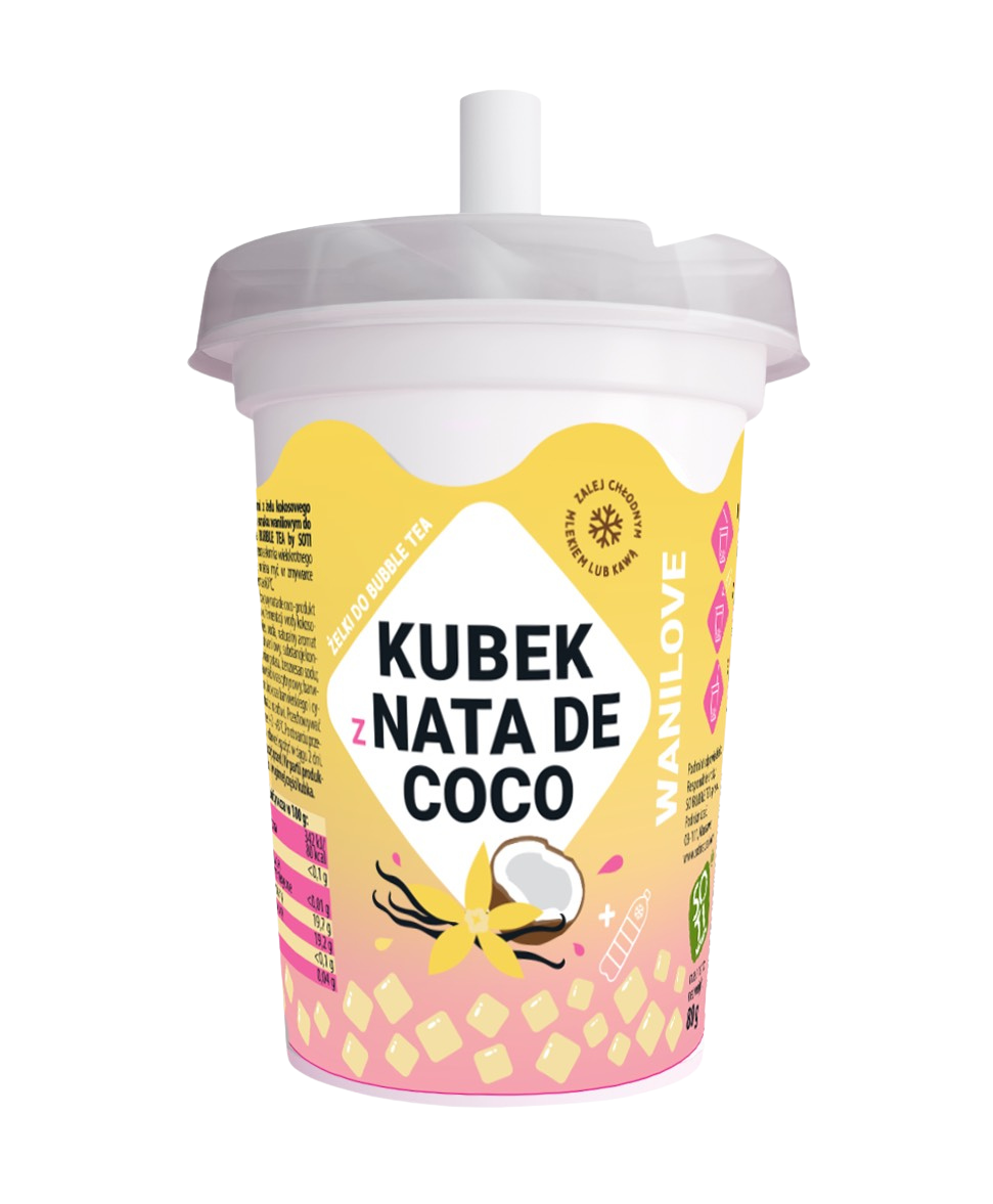- Kubki z nata de coco – zawierające delikatne, sprężyste kostki powstałe ze sfermentowanej wody kokosowej. To tropikalna przyjemność, która doda egzotyki każdemu napojowi.